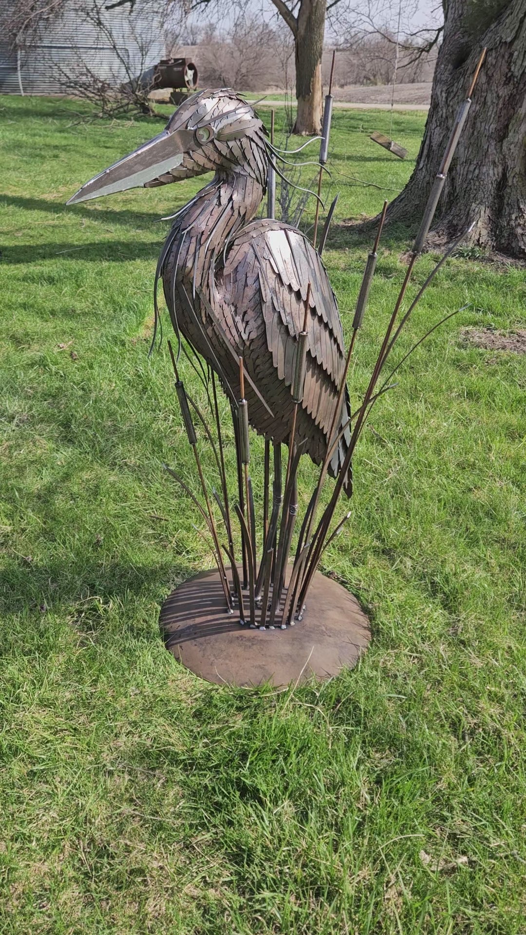 Artisan crafted metal sculpture of a heron in cat tails. Made from scratch out of steel with rust patina finish. This is a free standing sculpture and would make an excellent addition to either your inside or outoor setting! It is approx 4.5 ft tall x 4 ft long x 4 ft deep and built for durability.