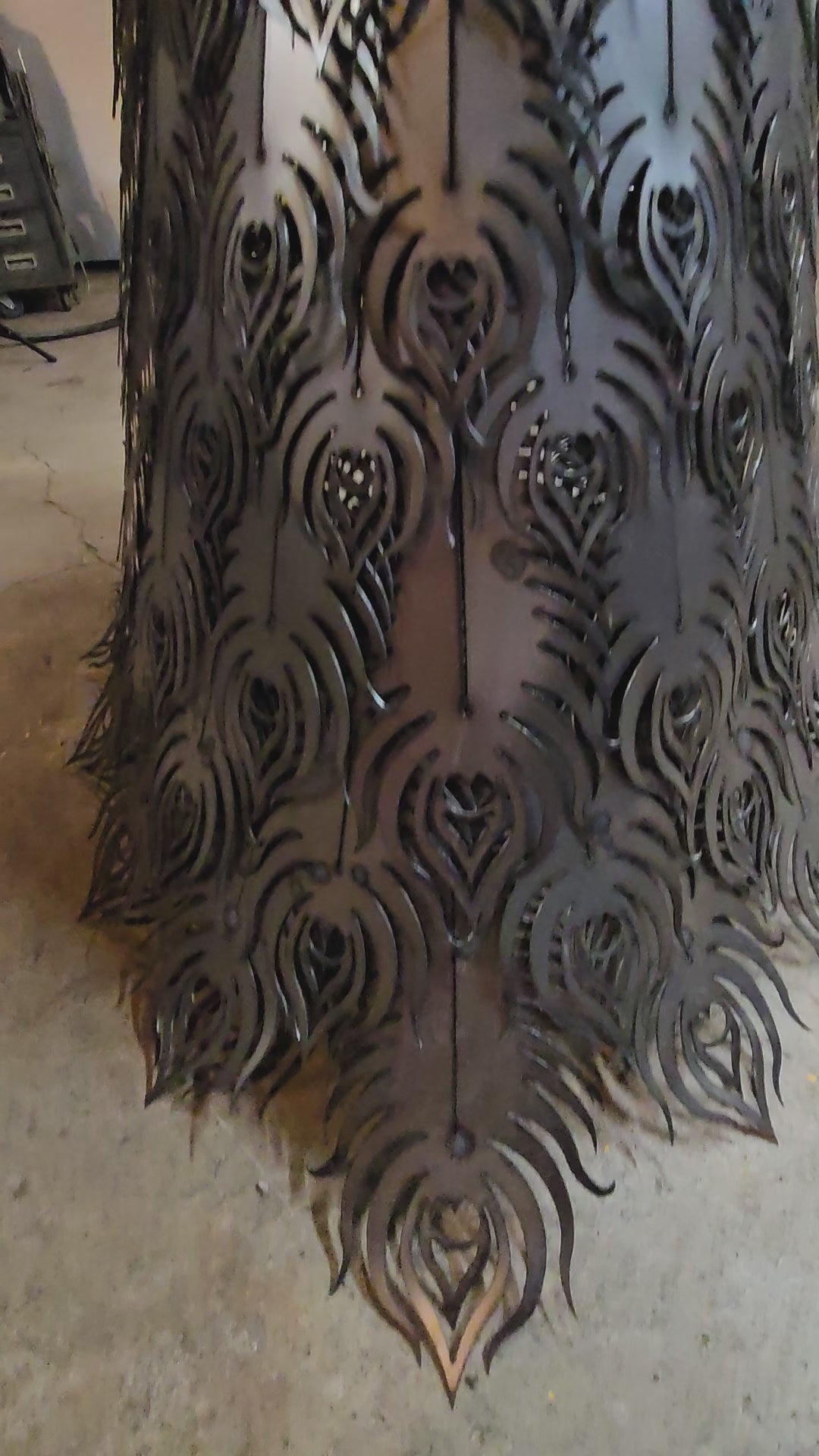 This beautiful sculpture stands approx 5 ft tall, is 4 ft in length and is 3 ft deep. With it's sweeping tail feathers, this piece is meant to be stunning. It's constructed of quality steel with the body built out of 18 gauge and the tail built of 20 guage with a robust rod and cage under structure. Also, the pedestal supporting this piece is designed to offset the weight of the peacock sitting on it, which means that it is significantly heavy, weighing approx 175 lbs.